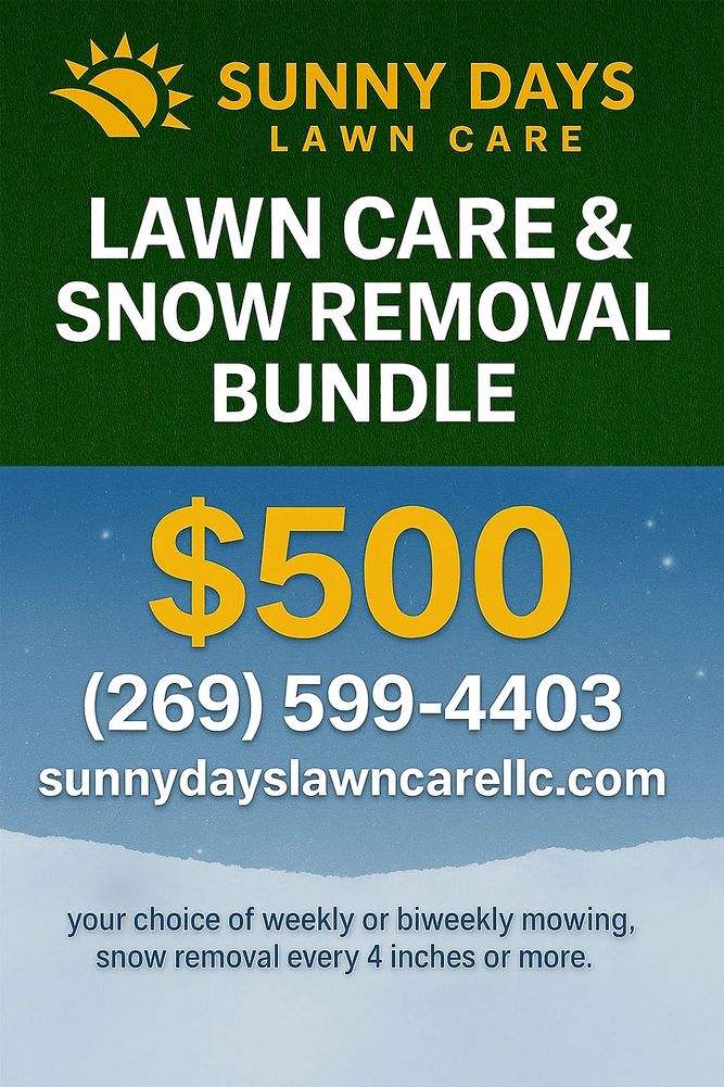Sunny Days Lawn Service offers an unbeatable bundle pack for hassle-free, year-round care in Kalamazoo and Battle Creek. Enjoy expert lawn care in Battle Creek, MI during the summer and priority snow removal in the winter, making scheduling and billing a breeze. For a limited time, grab the Snow Removal and Lawn Care Bundle for only $500 for a full year of service. With this package, you’ll receive priority attention and always have your driveway cleared quickly.